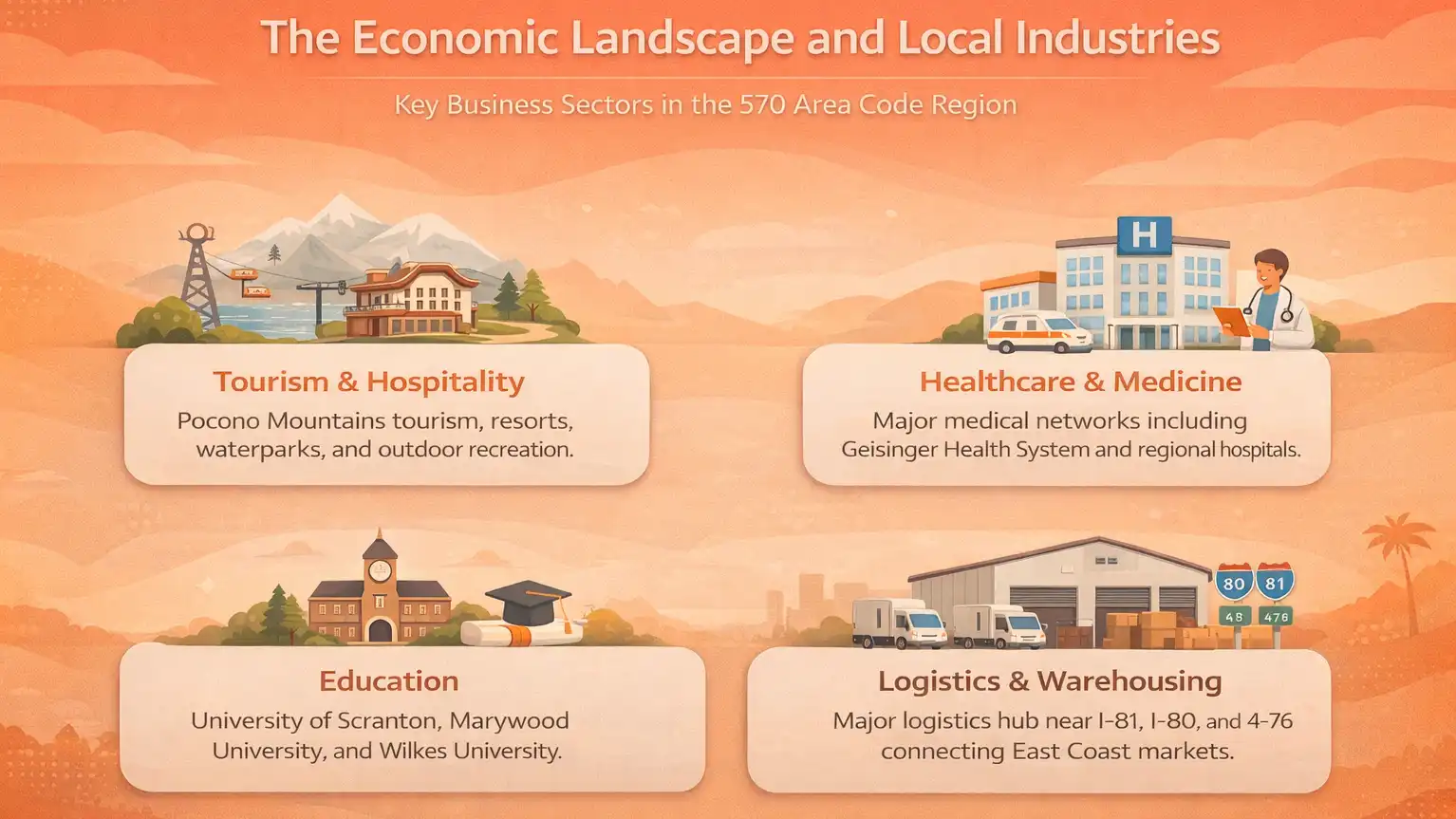 - Tourism and Hospitality: The Pocono Mountains are a massive year-round destination. From winter ski resorts and massive indoor waterparks to summer hiking and lakeside retreats, the tourism sector brings billions of dollars into the local economy. Businesses in the travel, hospitality, and outdoor recreation sectors will find a highly receptive audience when using a area code 570.