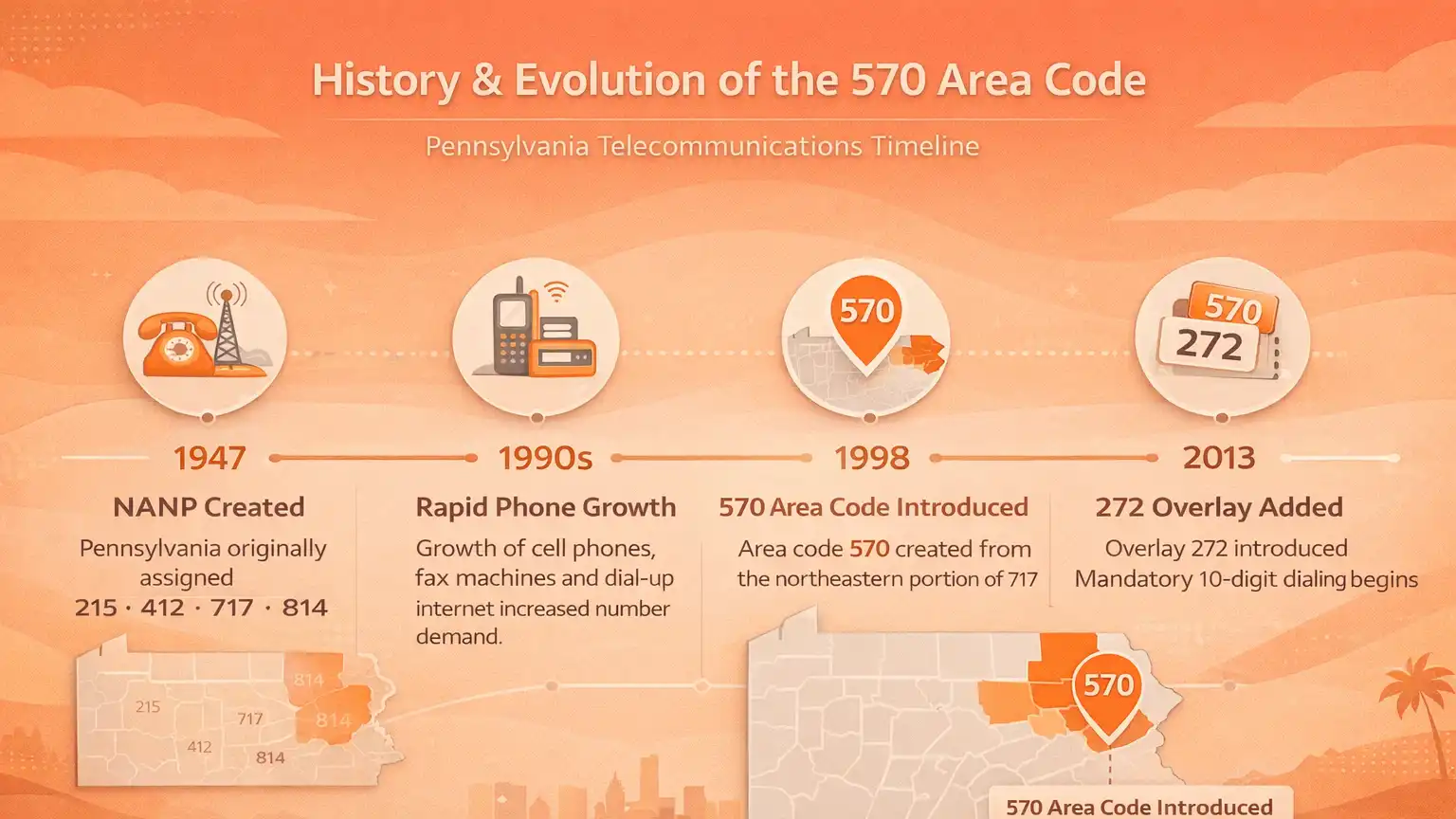 Technology continued to evolve, and by 2009, projections indicated that the available numbers in the northeastern PA region would once again run out. Instead of splitting the geographic region a second time—which would have forced millions of residents and businesses to change their established numbers—the PUC opted for an overlay. In 2013, the 272 overlay was introduced to serve the exact same geographic boundaries. Because of this overlay complex, mandatory ten-digit dialing was implemented, meaning residents must dial the area code 570 plus the seven-digit phone number for every local call.